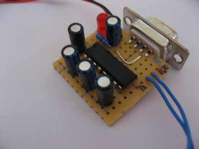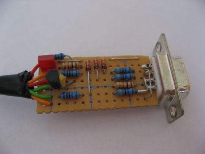 Die oben beschriebenen Module werden jeweils einzeln über diesen seriellen Adapter programmiert. Die Bauanleitung gibt's beim 'Pony'. Eine LED gibt Auskunft darüber, ob der Stecker korrekt am Roboter angeschlossen ist. |