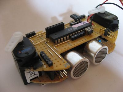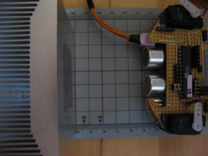 Fronteinheit des Roboters. Der ATMega8 (1Mhz) überprüft die Umgebung per Ultraschall. Zusätzlich werden zwei Servos angesteuert um die in einer späteren Ausbaustufe eingesetzen Infrarot-Distanz Sensoren zu drehen. Das Modul wurde so aufgebaut, dass nur zwei Leitungen benötigt werden, um Befehle und Daten mit einem zentralen Modul auszutauschen. |