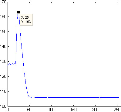 | Der Verlauf des Ultraschallempfängers, wie er vom Analog-Digital-Wandler aufgenommen wurde. Hier befindet sich das Objekt in einer Entfernung von 15cm. Der ADC sollte mit 50kHz-200kHz abgefragt werden, was bei 1 Mhz internem Takt einen Divisor von 20-5 bedeutet. Vom ADC werden nur die 8 höherwertigen Bits für die Weiterverarbeitung verwendet (ADCH, links ausgerichtet). |
